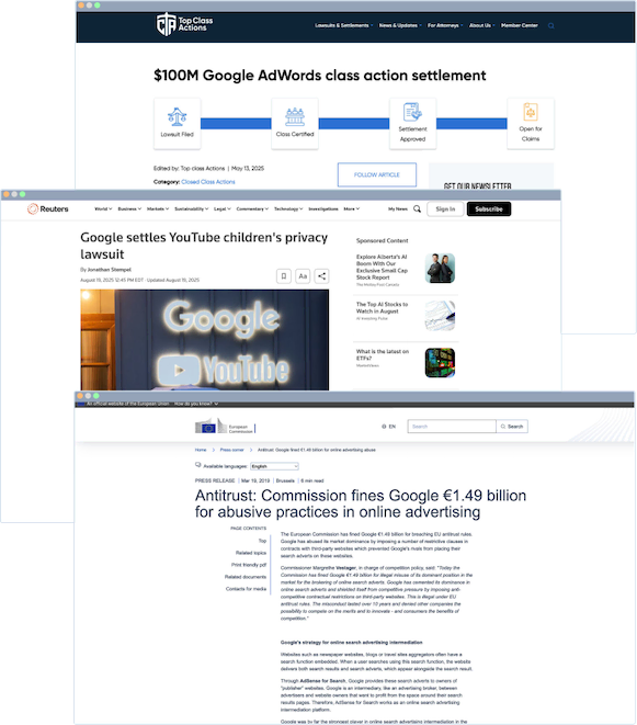 Sources: $100M AdWords settlement (Top Class Actions), Reuters privacy lawsuit, EU Commission 2019.